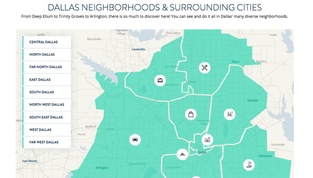 An interactive map gives a quick rundown of the happenings in each neighborhood and is easy to use whether the visitor is Dallas-savvy or a new kid on the block.