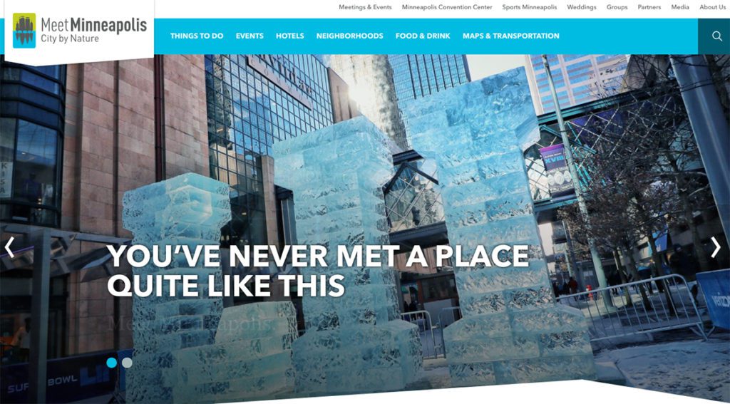 Large, attention-grabbing images influence the design, with enough white space to keep it clean. For an extra touch, there’s a virtual concierge that users access with #askMPLS for easy trip planning.