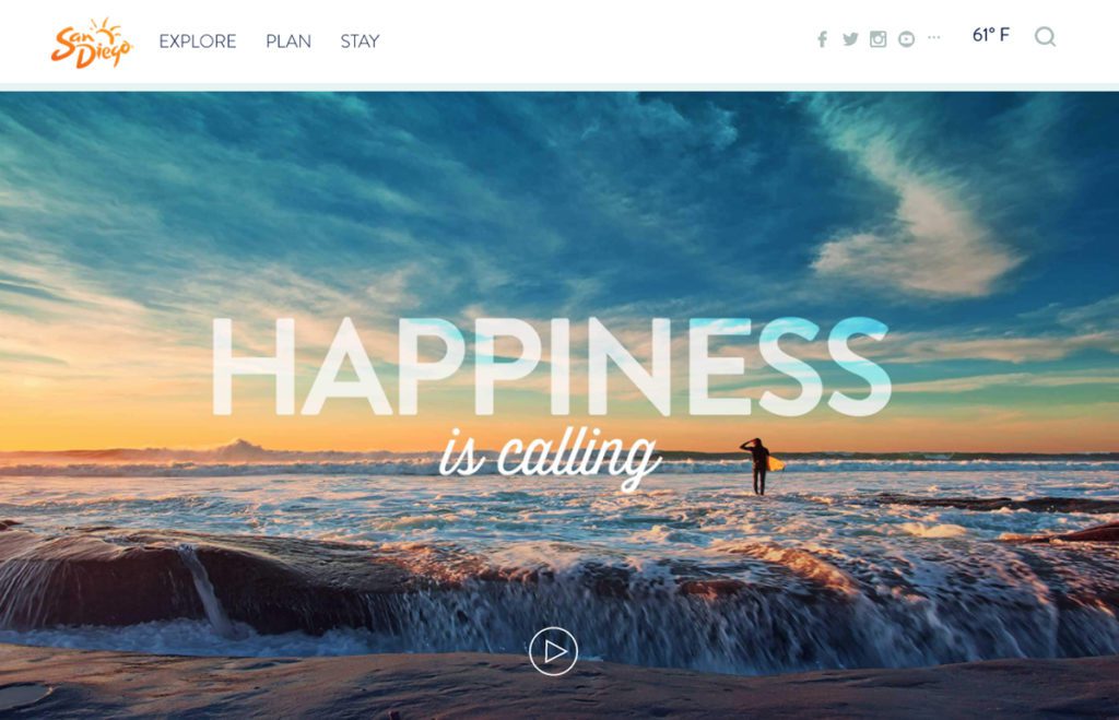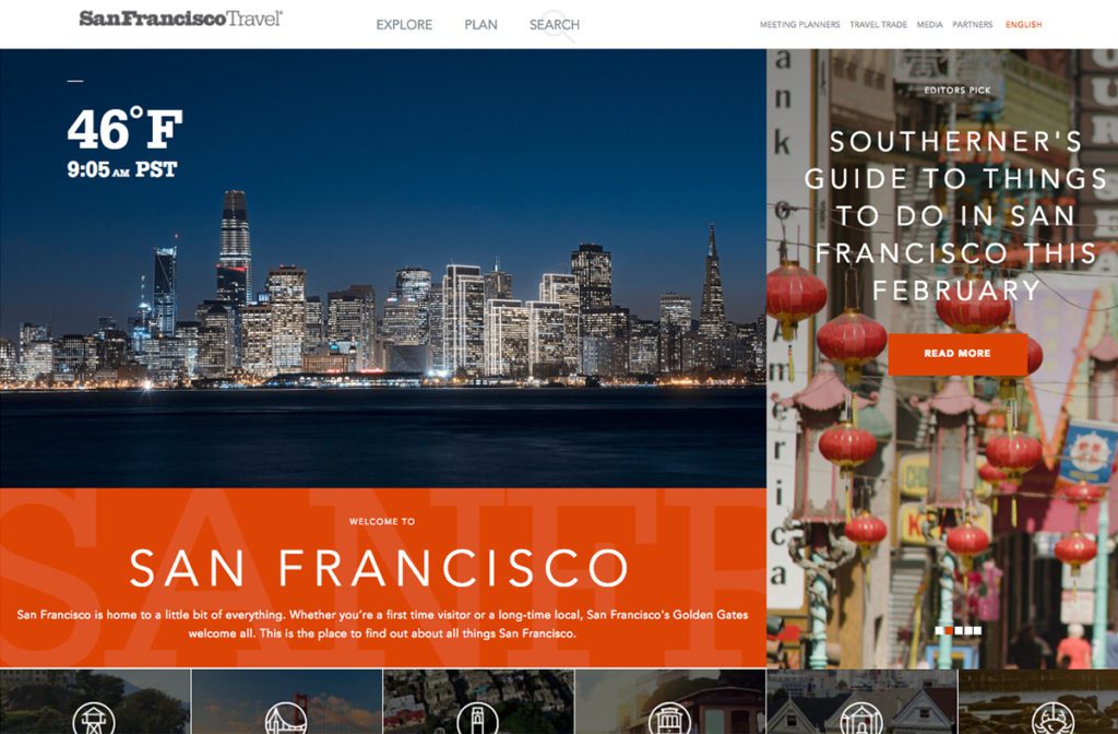 San Diego’s CVB doesn’t let their site’s visitors forget what they’re about: location, location, location. A clean, fresh color pallet of blue and orange reflects the ever-apparent beach culture. Plus, a compelling video with distraction-free functionality lets the user focus in a way we haven’t seen a lot.
